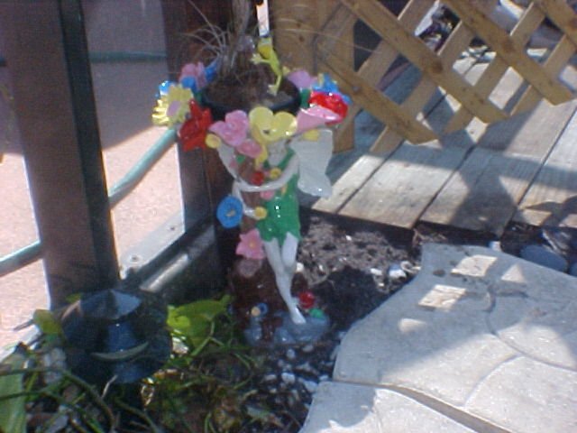 View showing new gate, Cathy's hand painted fairy and